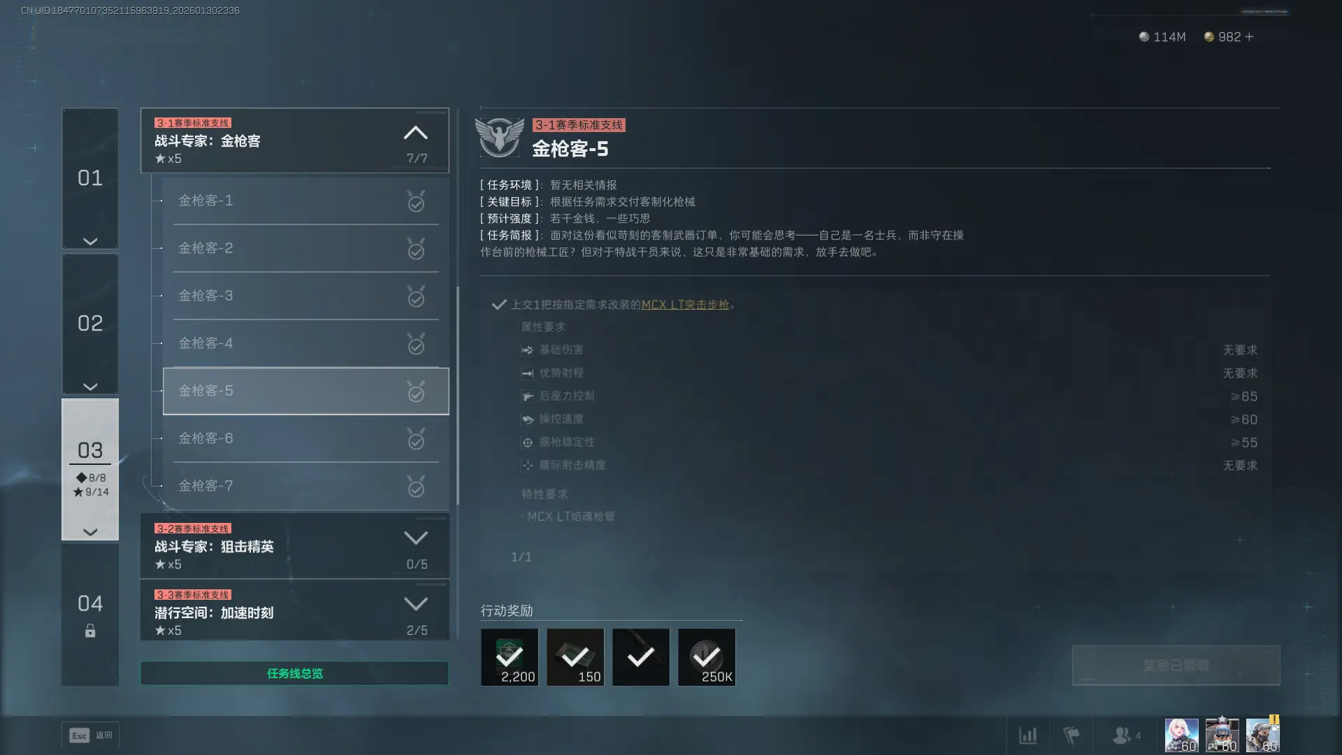4、任务奖励:经验x2200、.300 BLK TAC TXx150、半改MCX LT突击步枪x1、哈夫币x250000