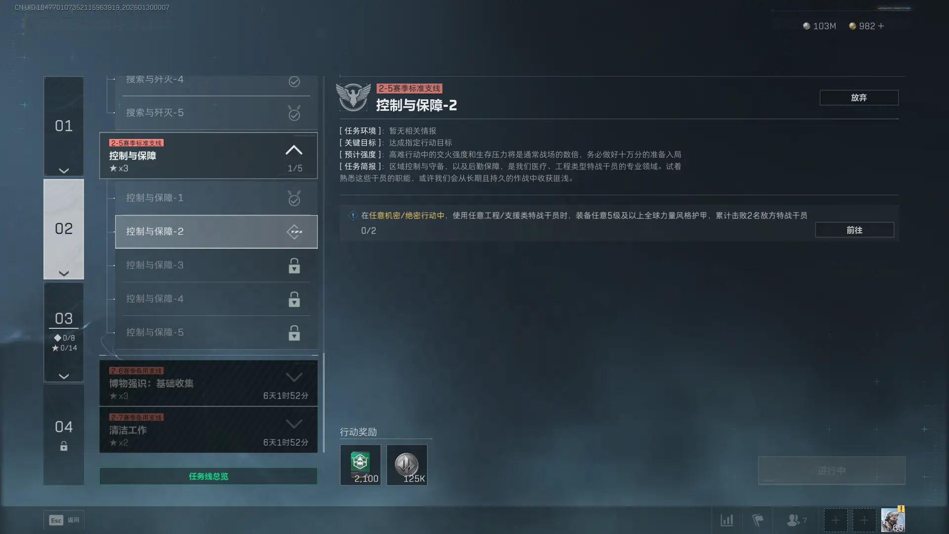1、任务目标:在任意机密/绝密行动中,使用任意工程/支援类特战干员时,装备任意5级及以上全球力量风格护甲,累计击败2名敌方特战干员。