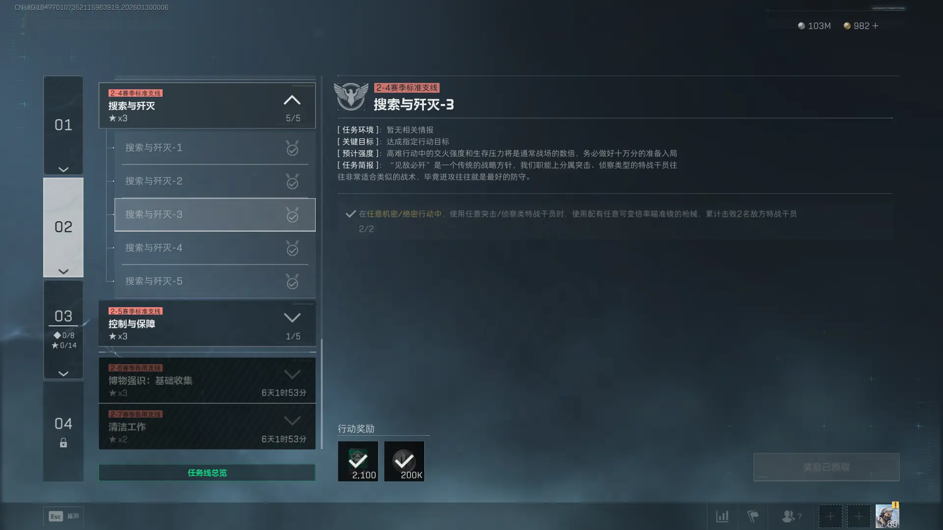 1、任务目标:在任意机密/绝密行动中,使用任意突击/侦察类特战干员时,使用配有任意可变倍率瞄准镜的枪械,累计击败2名敌方特战干员。